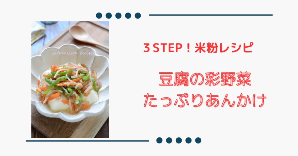 米粉で簡単おかず&簡単おやつ!3step米粉レシピを発信しています。 今回は、豆腐と冷蔵庫の残り野菜を使った節約レシピを紹介します。 1、細切りにした野菜と米粉をビニール袋に入れてまぶす2,フライパンで炒める3,タレを絡め、温めた豆腐にかける...