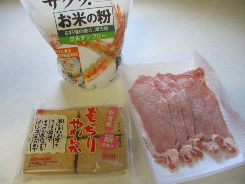 1,ビニール袋にカットした厚揚げ、豚肉を広げて入れ、米粉を加えてよく振ってまぶす。