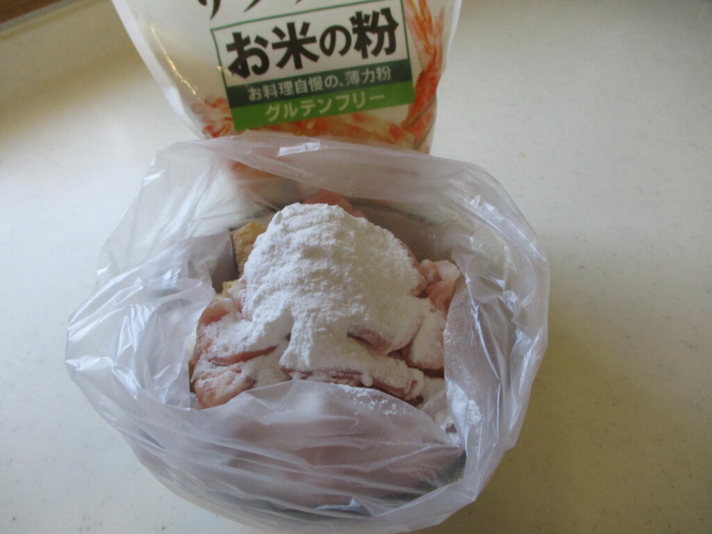 1、豚肉と厚揚げと米粉をビニール袋に入れてまぶす
