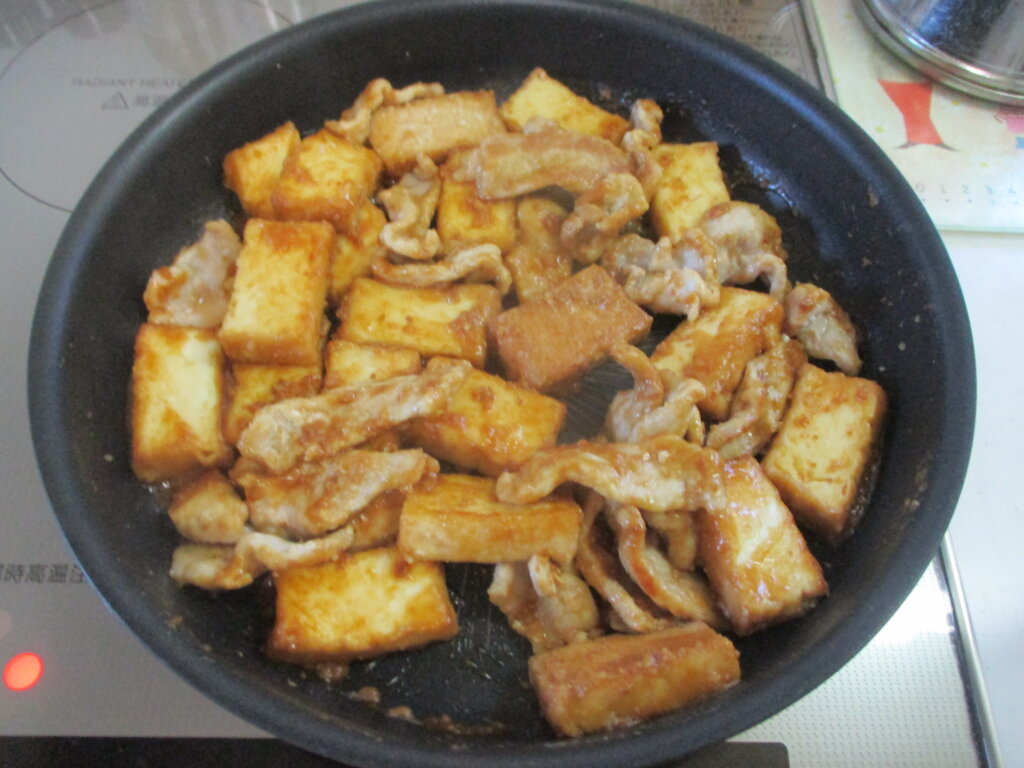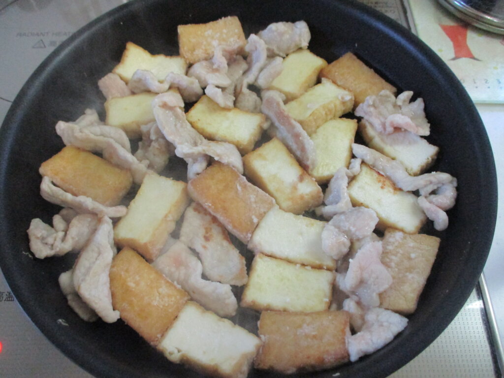 2,フライパンで厚揚げと豚肉を炒める。(様子をみて油を足す)