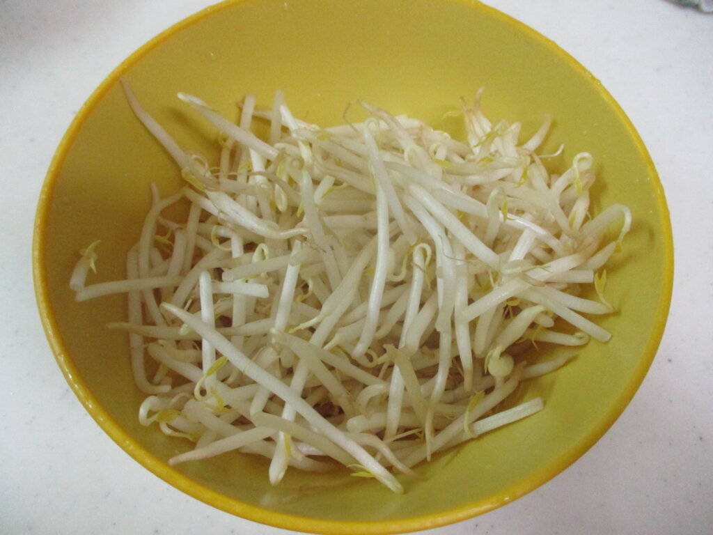 1,もやしを耐熱容器に入れ、油をからめて600wのレンジで2分加熱する。