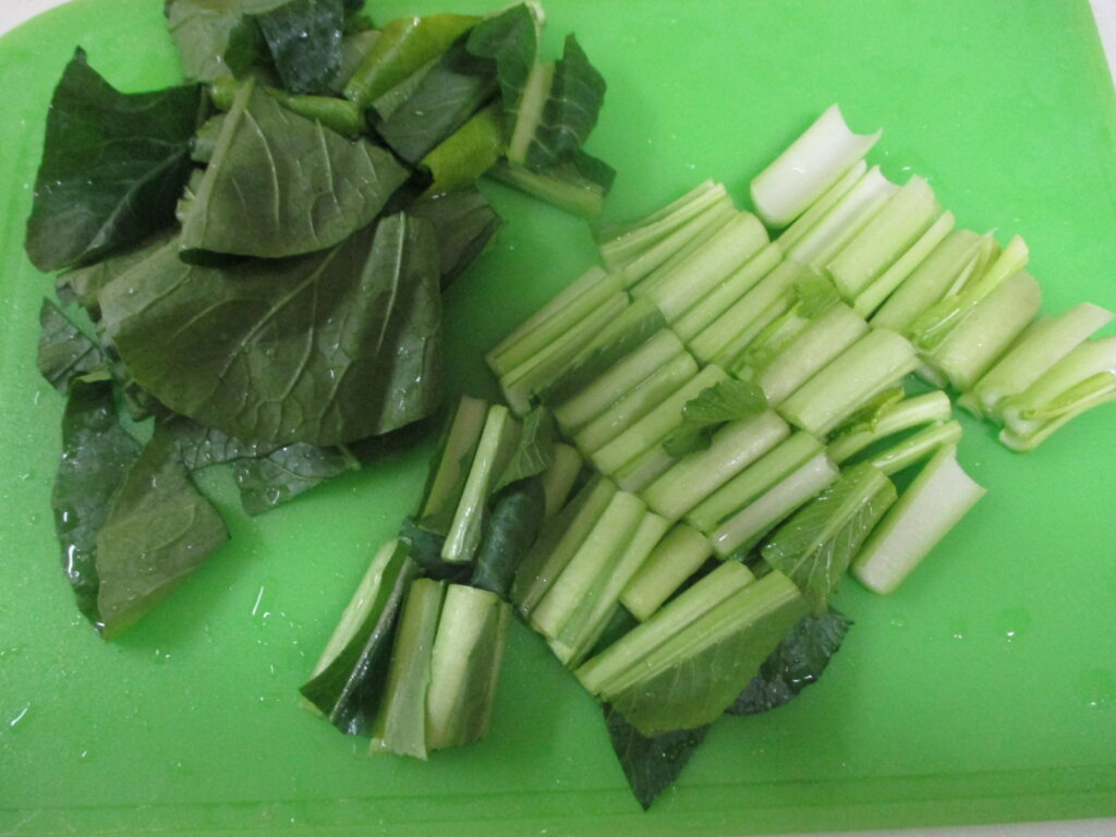 小松菜は茎の部分を最初に加熱し、葉の部分はあとから追加でのせて加熱することで