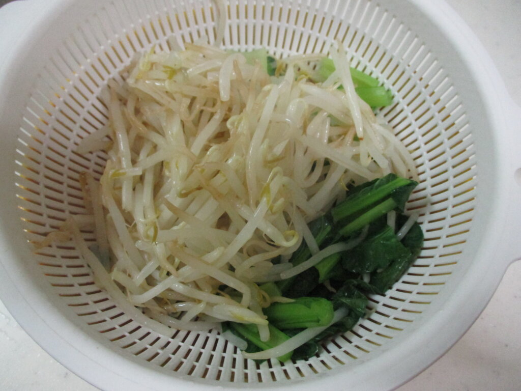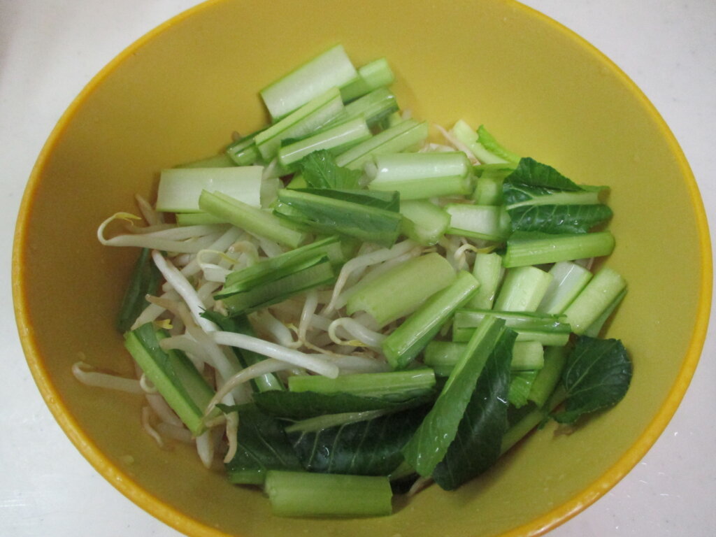 2,小松菜は茎と葉の部分に分け3㎝程度の長さにカットし、もやしを加熱したあと、もやしの上に茎をのせてさらに600wのレンジで2分加熱する。