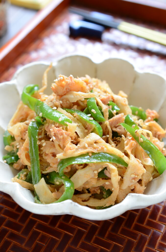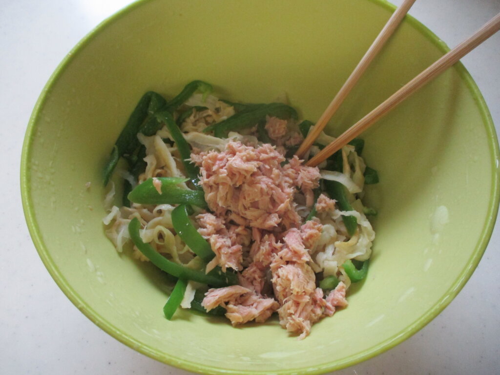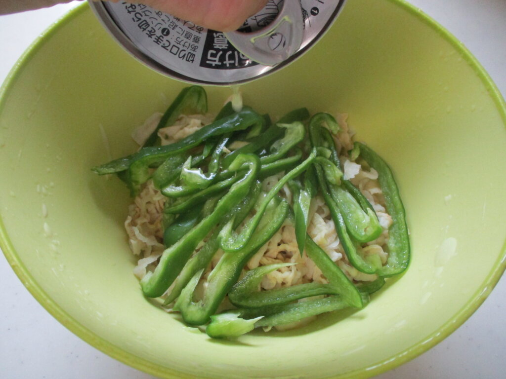 ツナのオイルはピーマンを加熱するときに加えましたが、