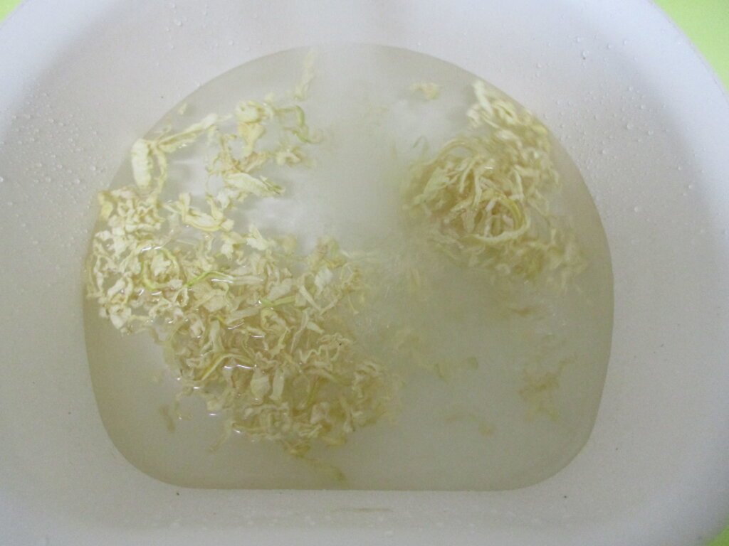 1,切干大根はたっぷりの水でふり洗いしてゴミなど落とし、水気を絞らず耐熱容器に入れ、さらに水大さじ1を加えてラップをして600wのレンジで3分加熱する。