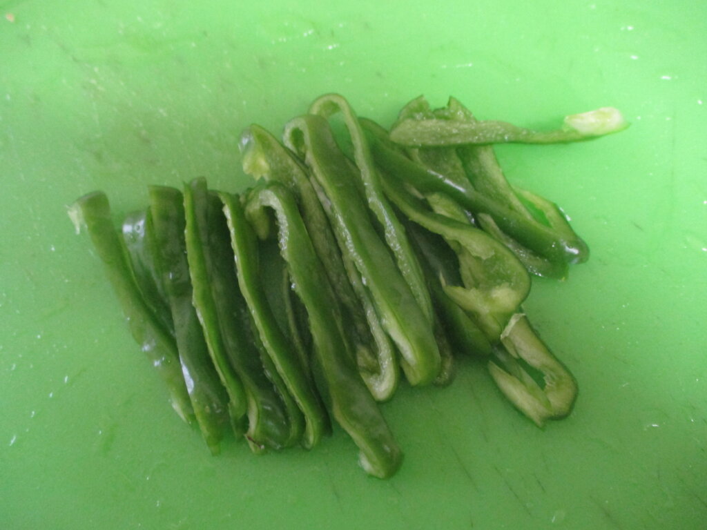 2,加熱している間にピーマンを細切りにする。