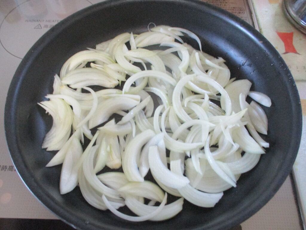 1,玉ねぎは薄切りに、りんごは皮をむいてイチョウ切りにする。生姜は千切りにする。