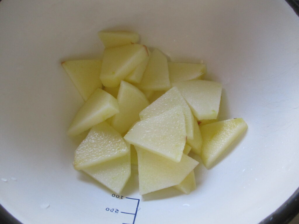 りんごを食べる時は皮付で食べる私ですが、今回、お料理に使うので、口当たりをよくするために皮は剥いています。