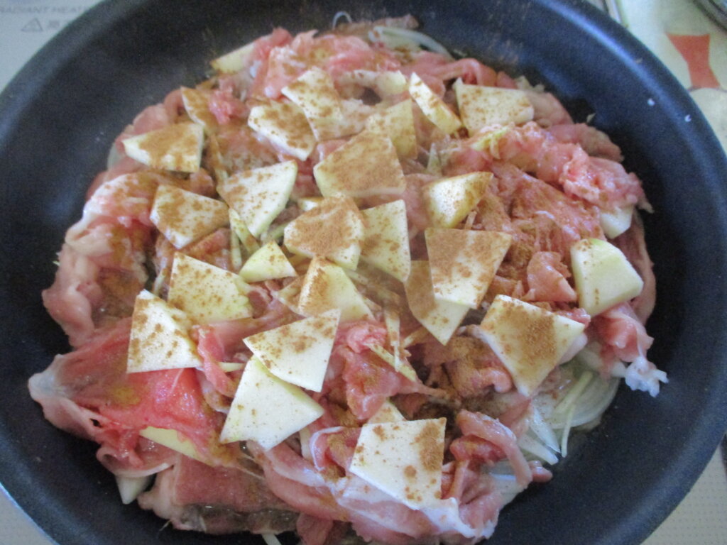 2,フライパンに玉ねぎを入れオリーブオイルを絡めて全体に広げたら、上に豚肉1/2量を広げ、軽く塩をして生姜、りんごをそれぞれ1/2量全体にひろげ、残りの豚肉を広げて塩をし、生姜、りんごの残りの1/2量を広げ、お好みでシナモンパウダーをふりかける。(量が多いので、豚肉を2回に分けて重ねています)