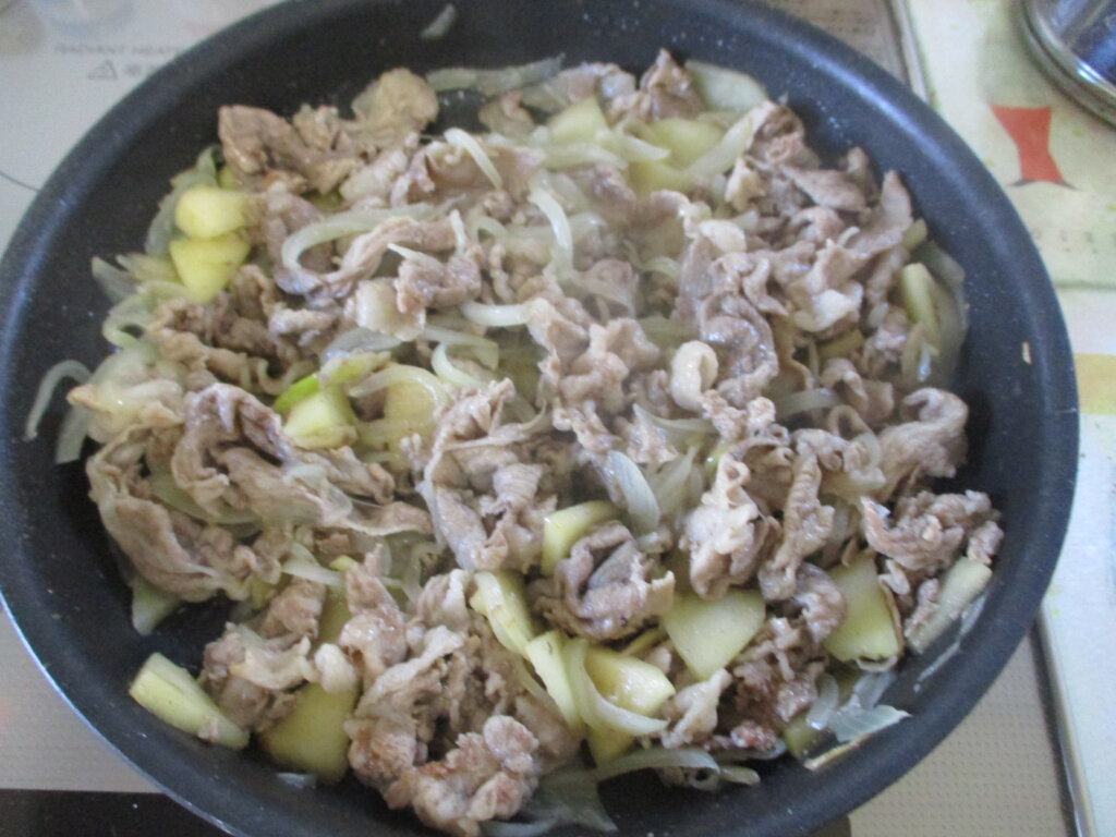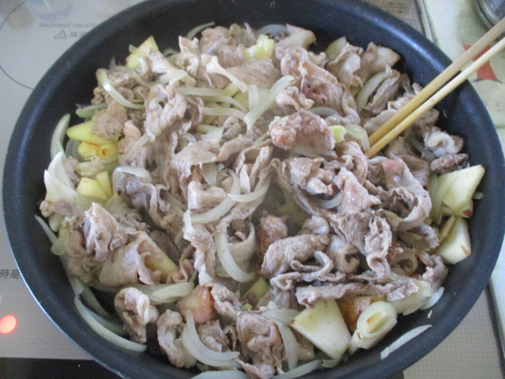 皮をむいてイチョウ切りにして豚肉と一緒に炒め合わせると、トロッとしたりんごペーストのような感じになり
