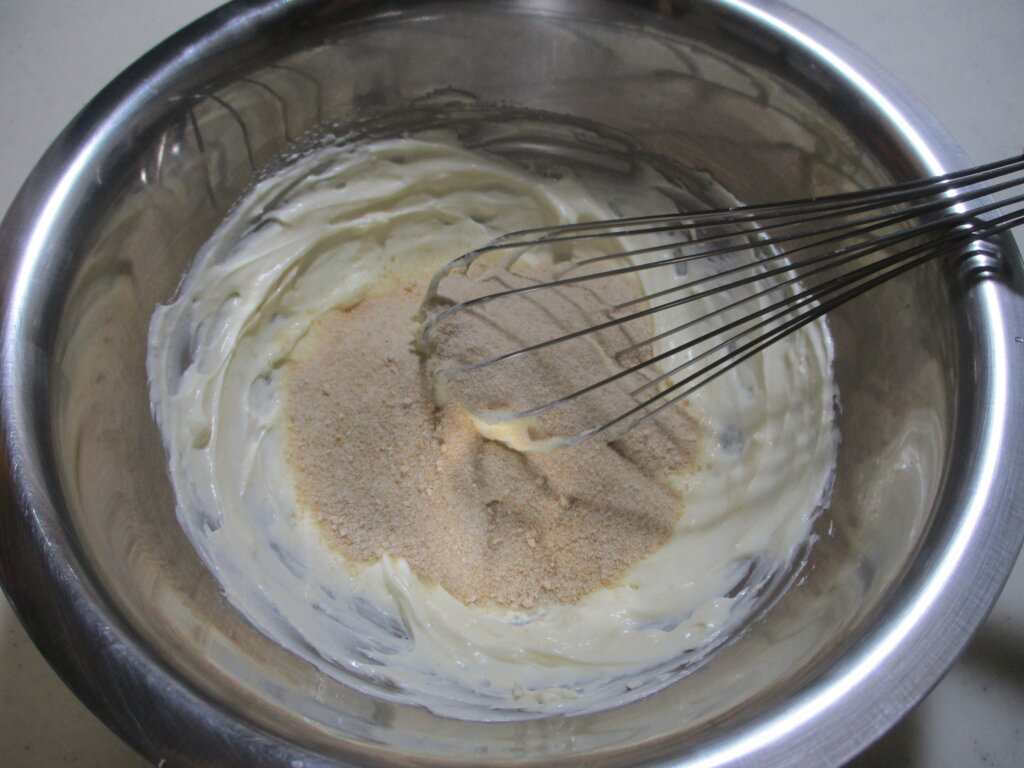 1,クリームチーズを柔らかくして砂糖を加えたら卵を少しずつ加えてよく混ぜる。