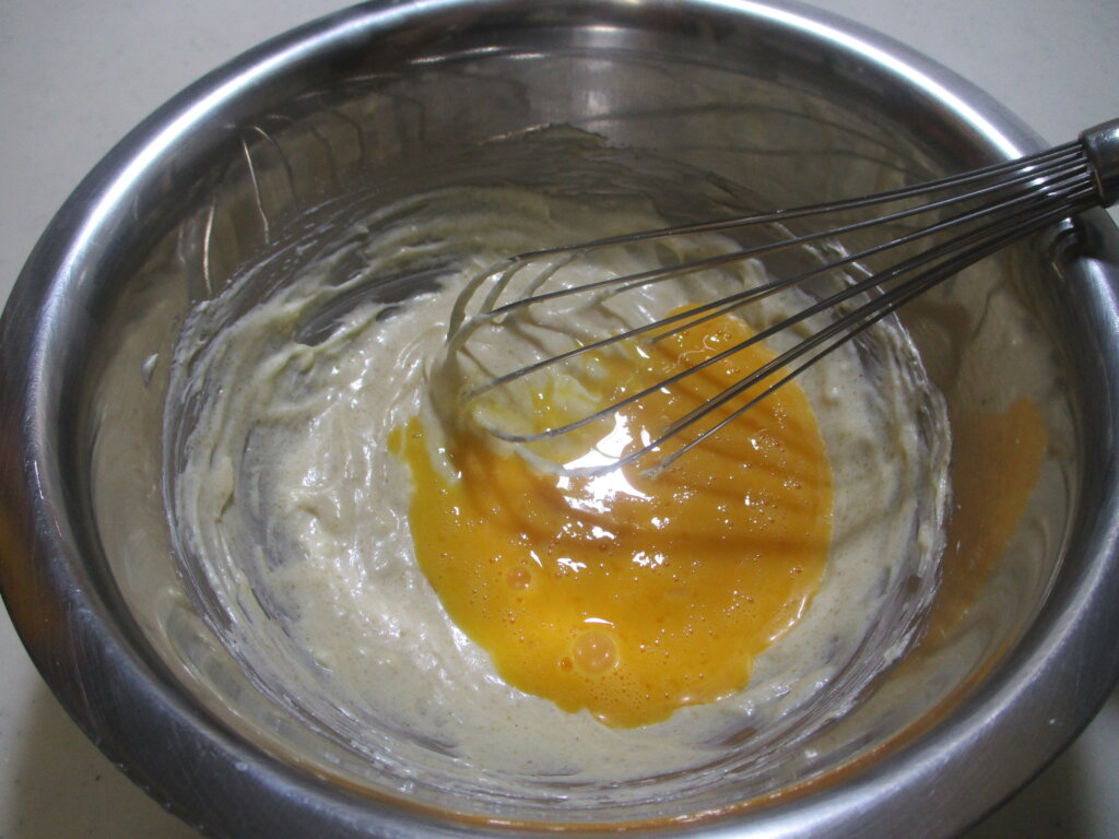 クリームチーズに卵を加える時、少しずつ加えていくと簡単できれいに混ぜることができます。