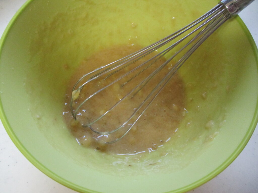 1,バナナを潰して砂糖を加え泡立て器でふわふわになるよう混ぜたら、卵、米油を加えて混ぜ合わせる。