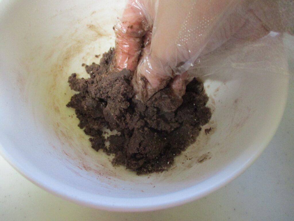ココアパウダーを加えているので、米粉だけよりは比較的しっとりまとまりますが、