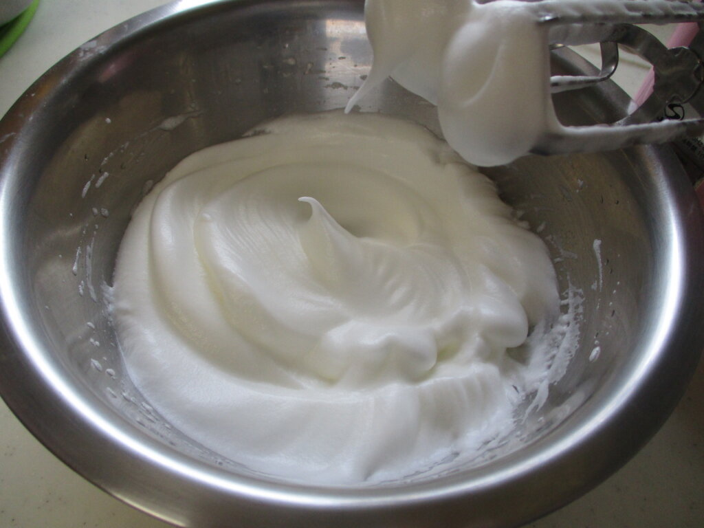 2,卵白とグラニュー糖を混ぜハンドミキサーでピンと角が立ったあと軽くおじぎをするくらいのメレンゲを作る。
