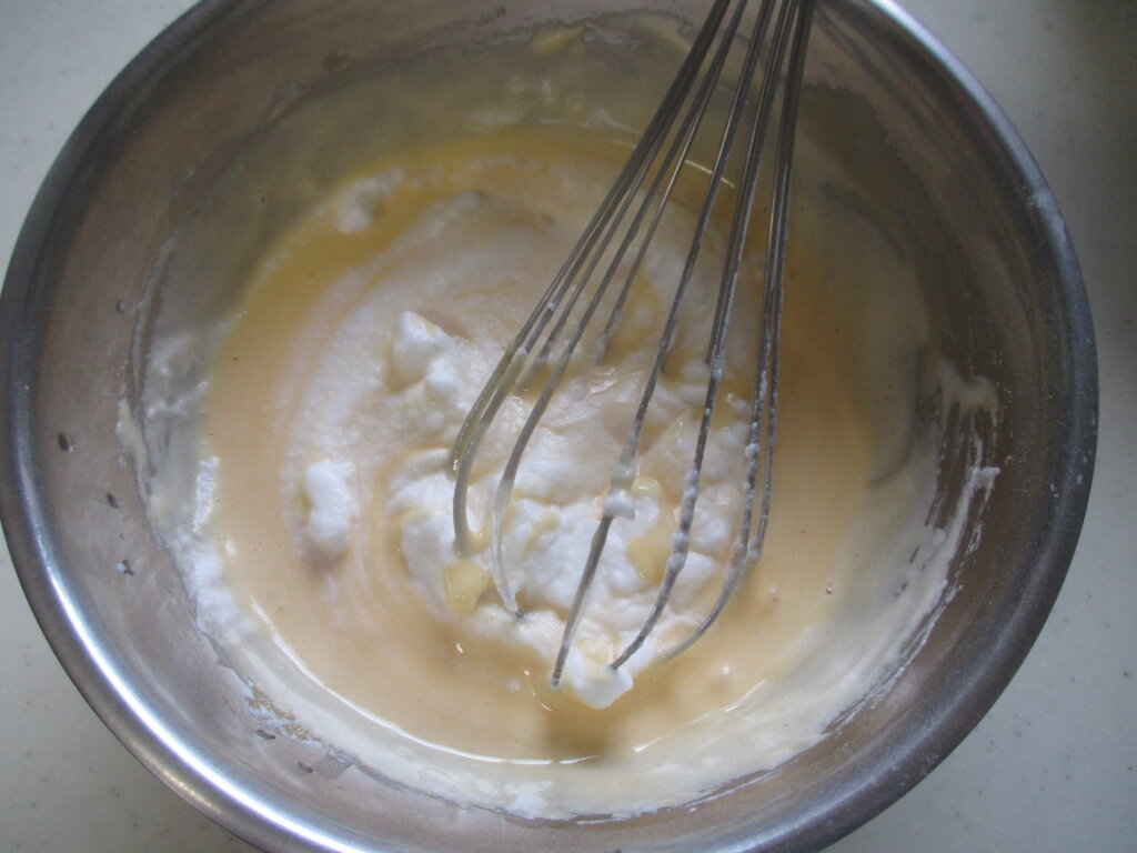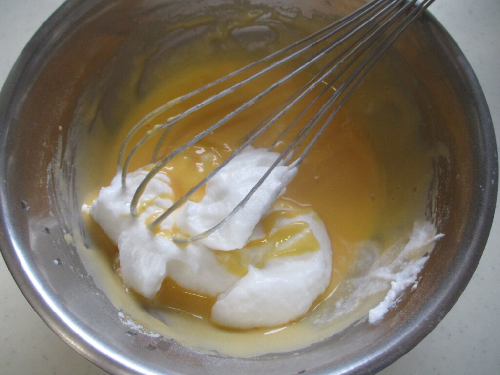 最初に、卵黄の生地にメレンゲの1/4量を入れてなじませてください。