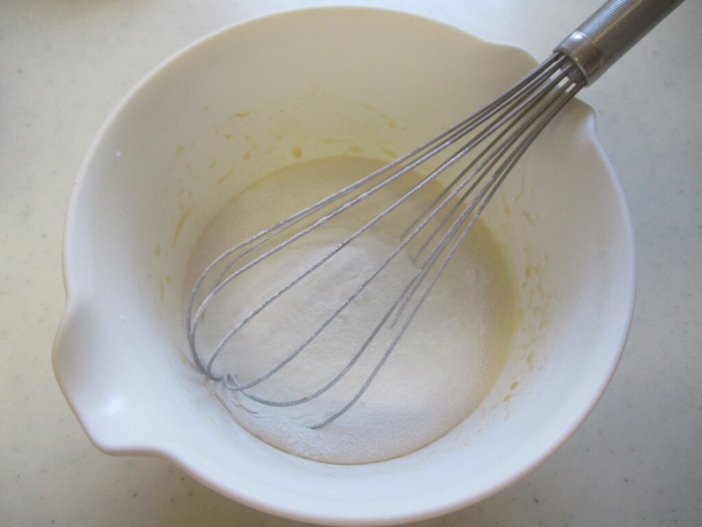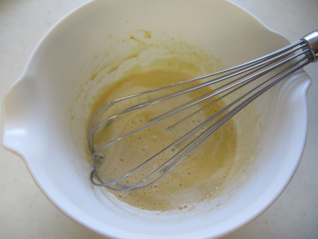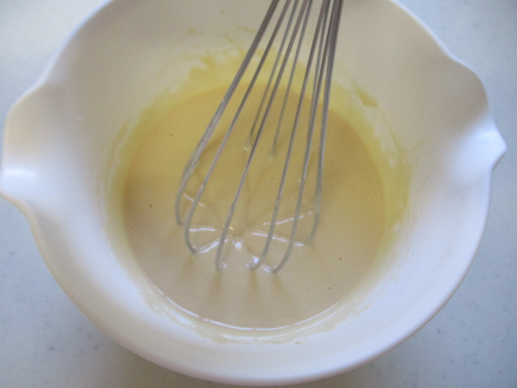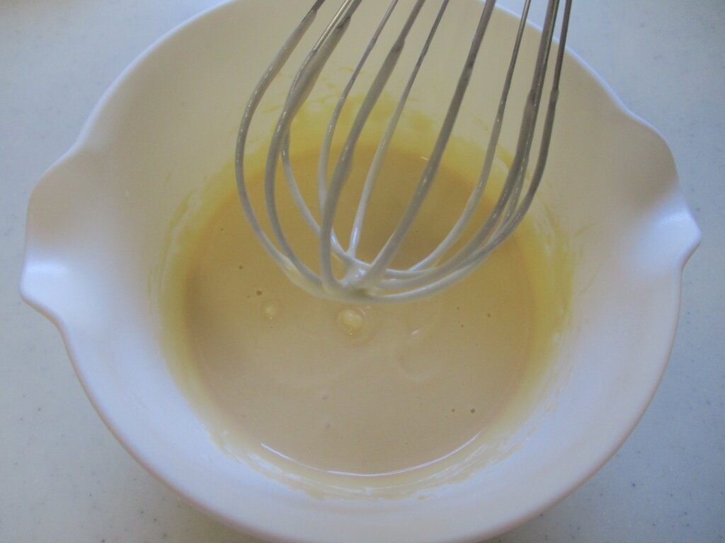 1,ボウルに卵を割り入れほぐしたら、砂糖を加えてよく混ぜ、米油、牛乳の順に加えてよく混ぜる。