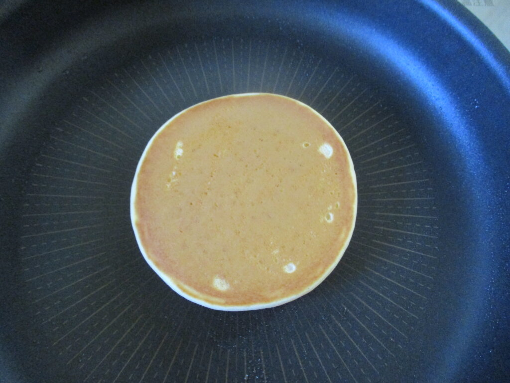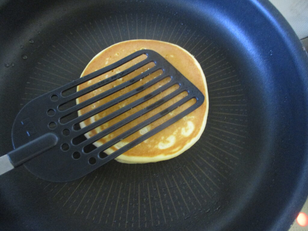 裏返したすぐに、フライ返しで生地を軽くおさえてあげると、裏面も焼き色が全体にきれいにつきます。