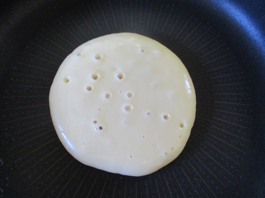 3,中火に熱したフライパンにお玉1杯分の生地を中央に流し入れ、弱めの中火で3分ほど焼いたら裏返して、裏面もも3分ほど焼く。