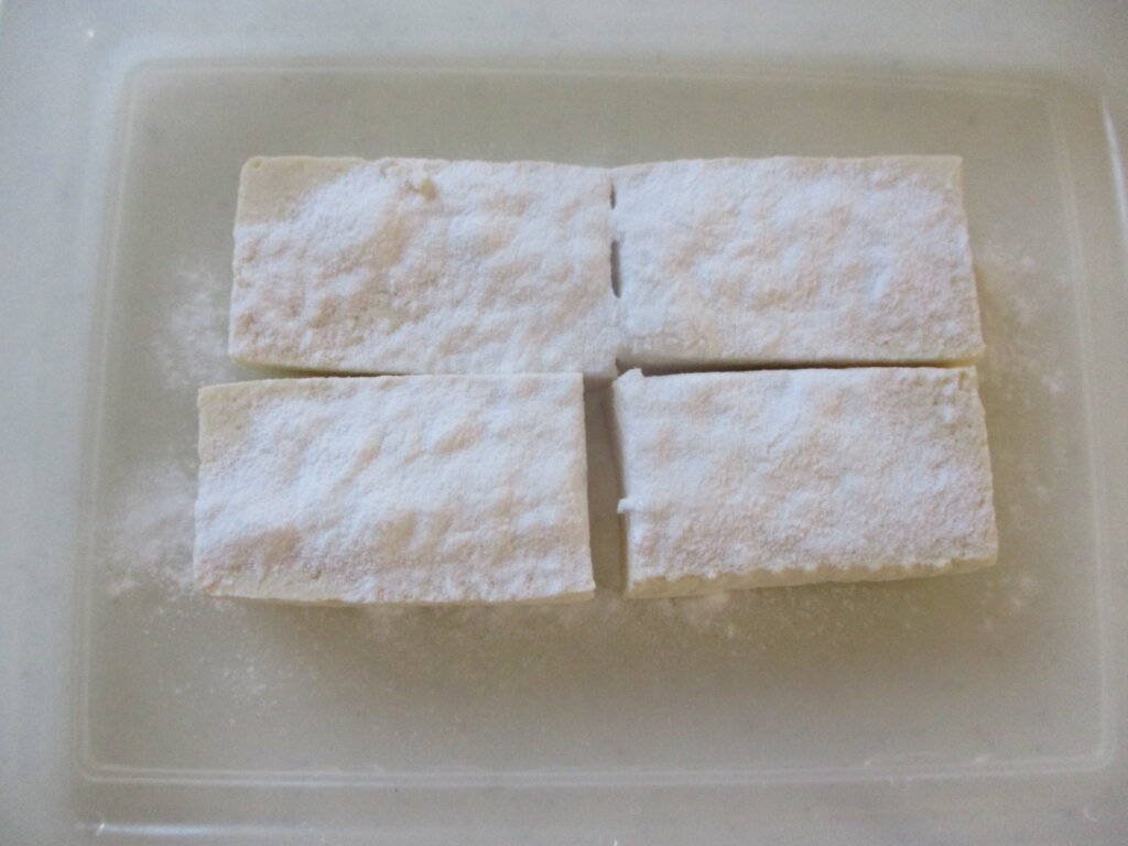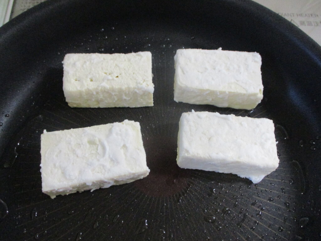 1,豆腐に米粉をまんべんなくまぶしたら薄く油をひいたフライパンに並べ両面を焼き色がつくくらいまで焼く。