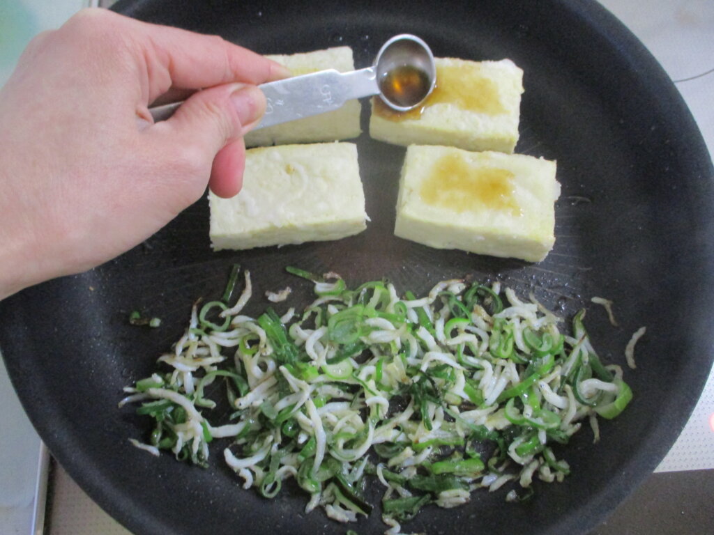 2、豆腐が焼けたらフライパンの半分スペースを作り、しらすと小口切りにしたネギを入れ◎を加えて炒める。