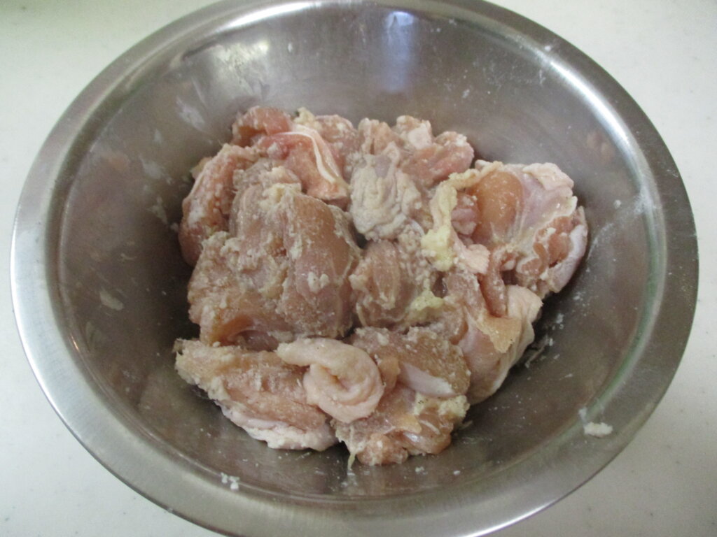 1,一口大にカットした鶏もも肉に強めに塩、こしょうをし、酒をまぶしたら全体に米粉をからめる。
