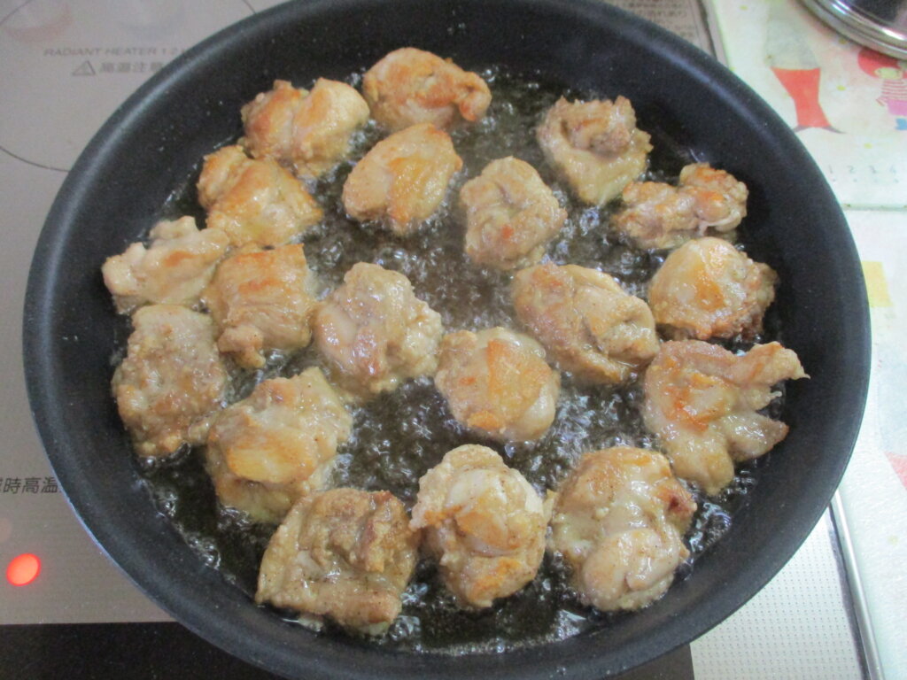 2,フライパンに1㎝ほどの高さまで油を入れて鶏肉を揚げ焼きし、油をきっておく。