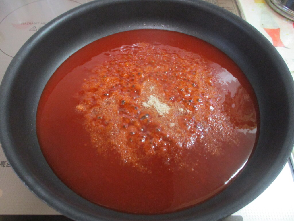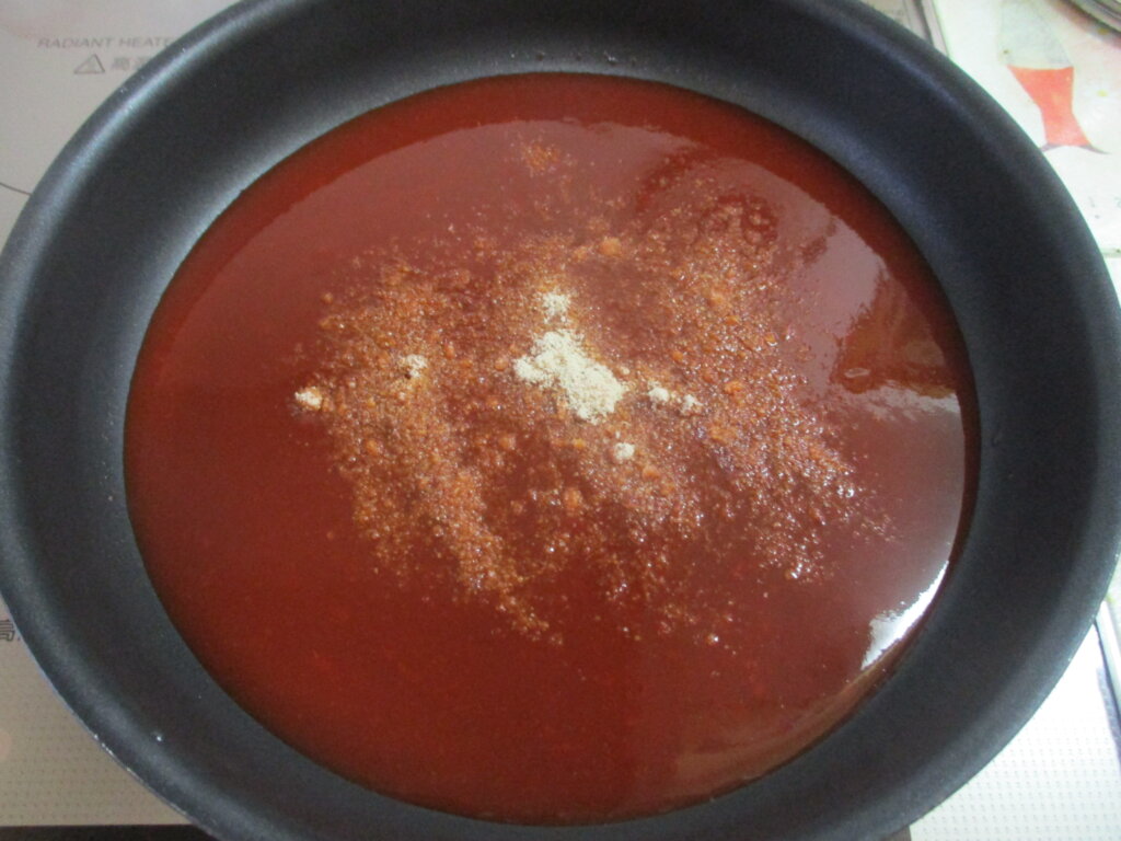 3,材料のケチャップ~みりんまでをよく混ぜておき、フライパンに入れて弱火にかけたら、アーモンドパウダーを加えて煮詰める。