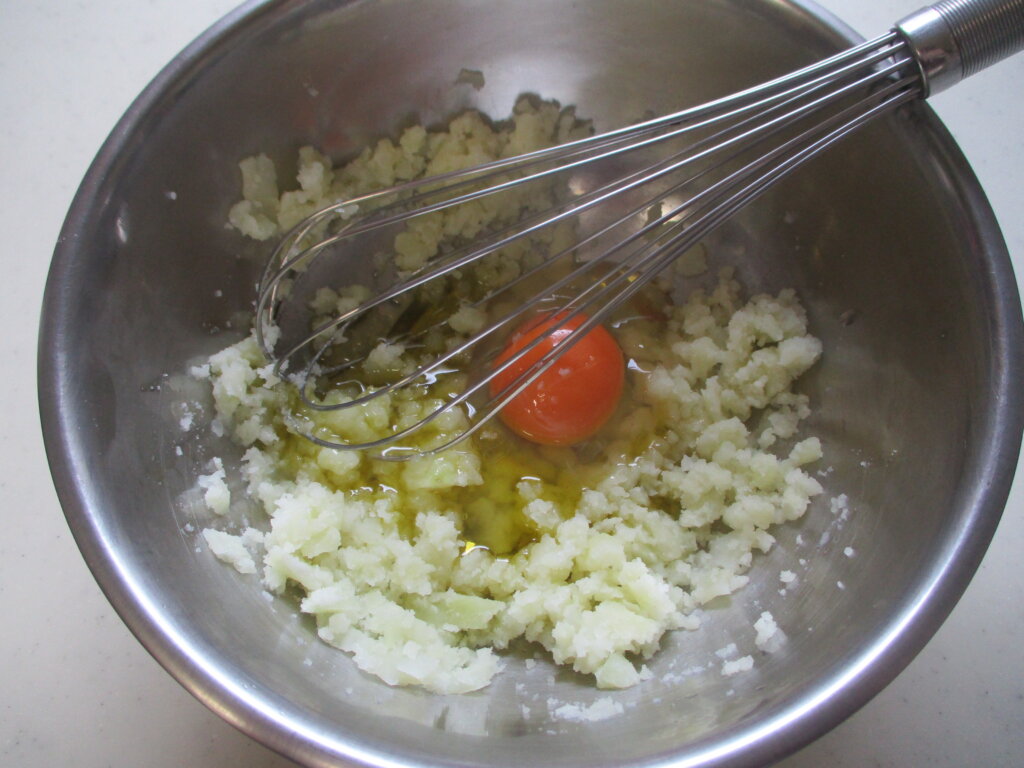 2,マッシュしたじゃが芋に卵、塩、オリーブオイルを加えてよく混ぜる。