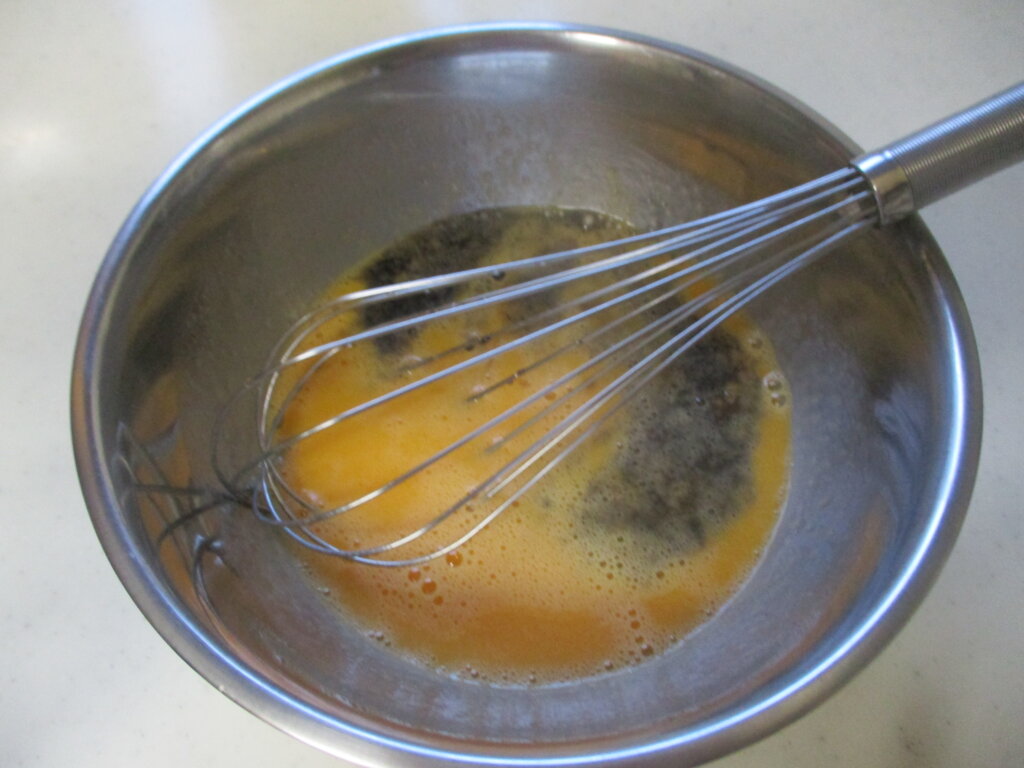 1,ボウルに卵と米油を加えてよく混ぜたら、黒豆煮汁を加え混ぜ合わせる。
