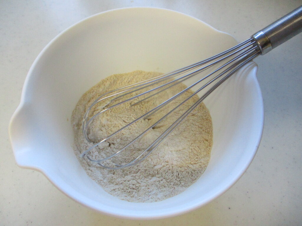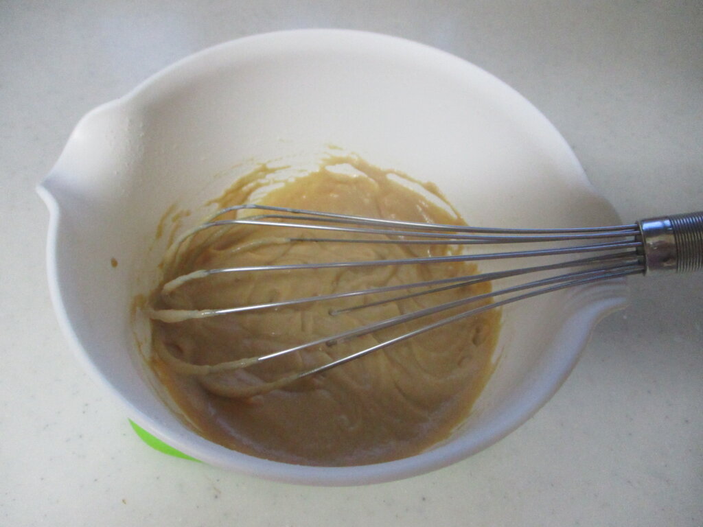 2,ボウルに米粉、きな粉、ベーキングパウダーを入れよく混ぜたら、溶かした黒糖液を加えて混ぜ合わせ、プレーンヨーグルト、米油の順に加えてしっかりと混ぜ合わせる。