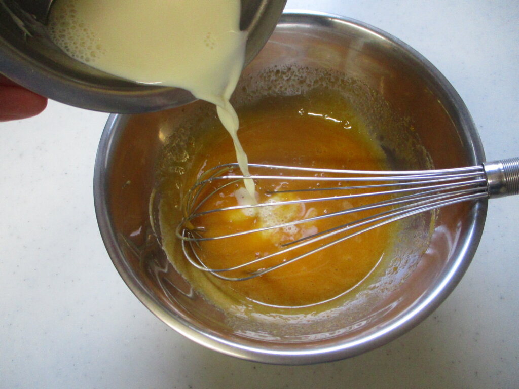 1,卵黄と砂糖をよく混ぜたら米油、豆乳を加えて混ぜ合わせ、米粉とココアパウダーも加えて泡立て器でしっかりと混ぜる。