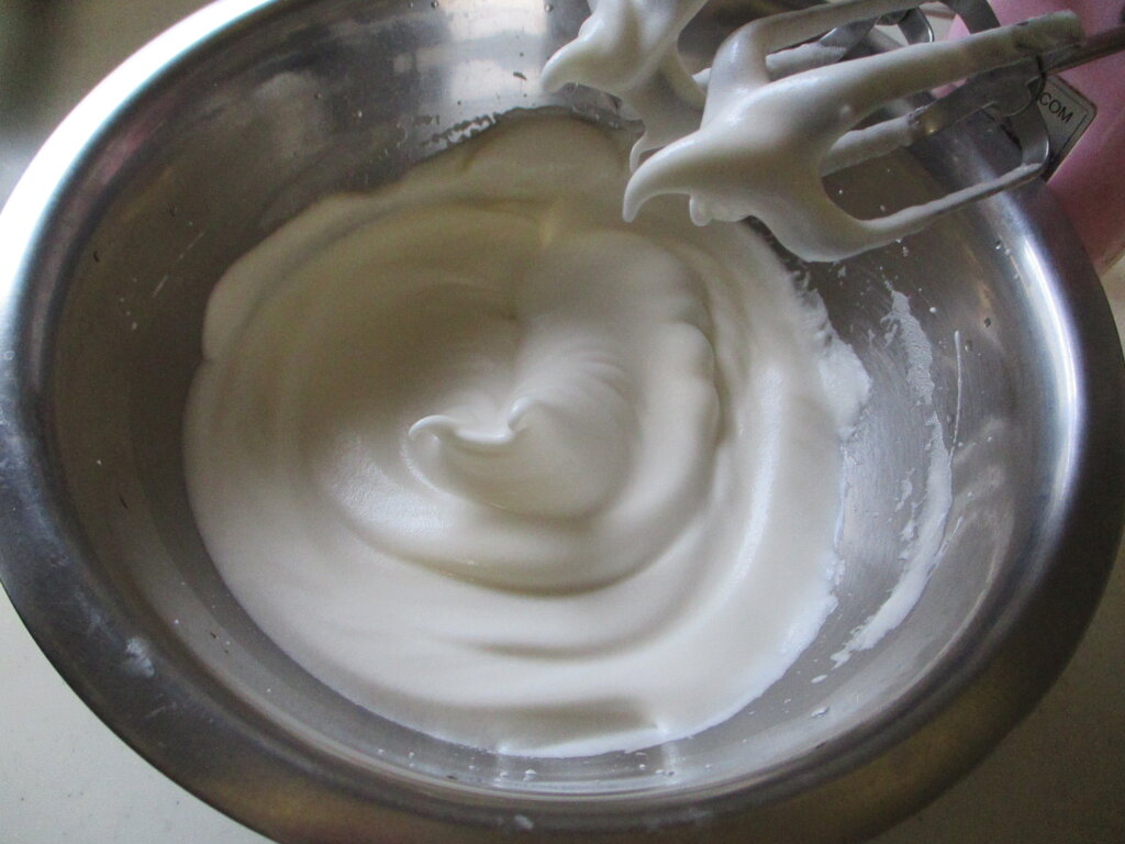 2,別のボウルで卵白と砂糖を泡立て、ふわっとおじぎをするくらいのメレンゲを作る。