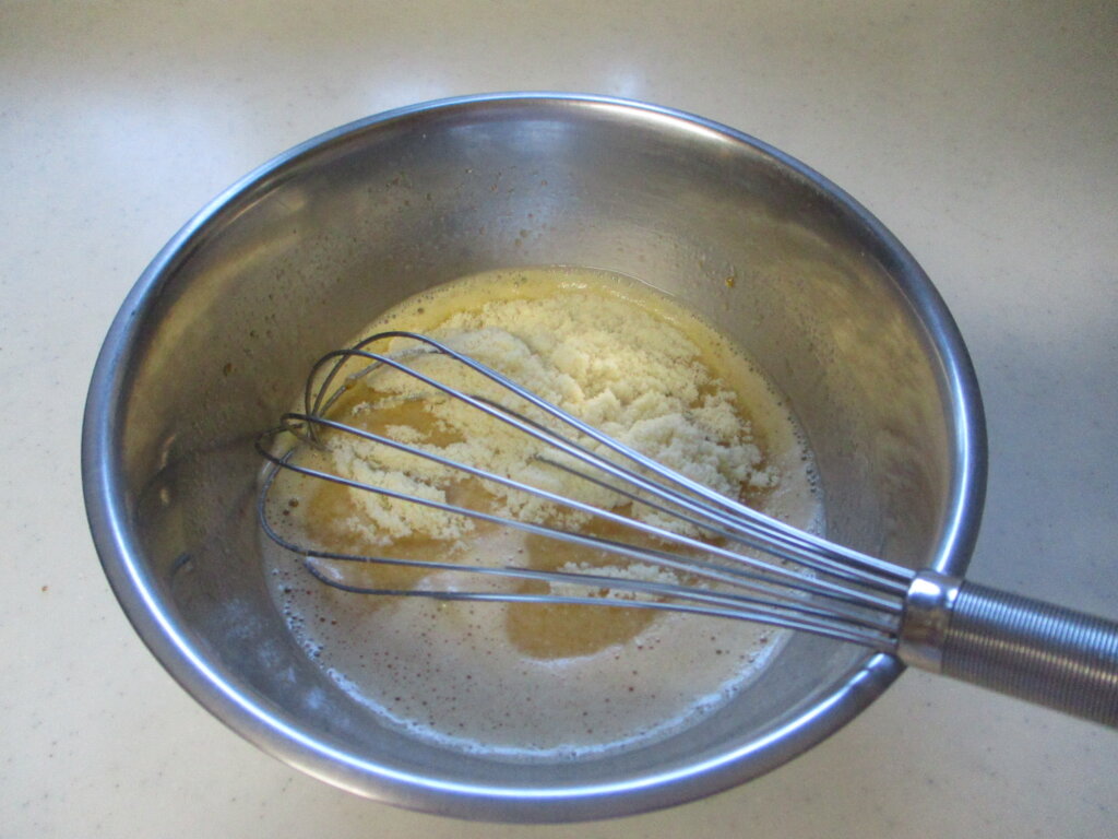 2,アーモンドパウダーを入れ混ぜ合わせたあと、米粉100gを加えてしっかりと混ぜる。
