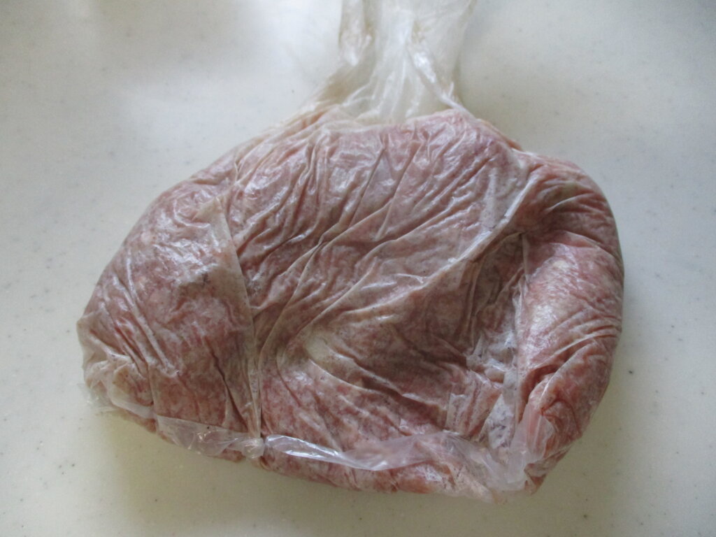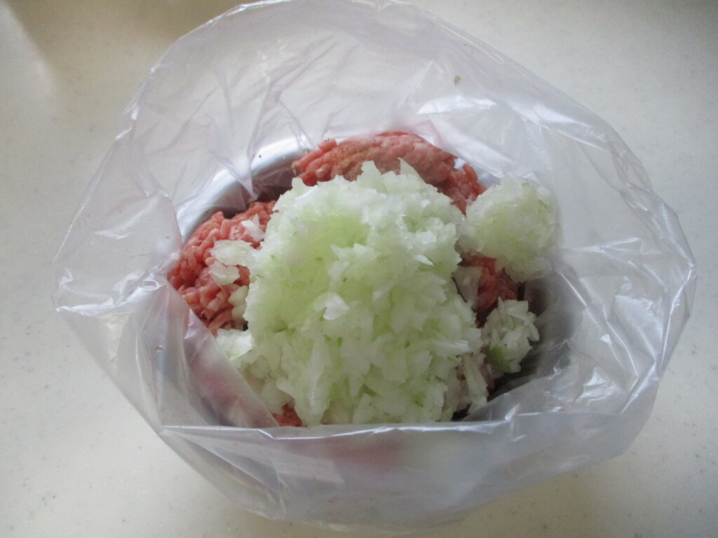 1,玉ねぎを細かくみじん切りにし、ポリ袋に、合いびき肉、玉ねぎ、塩、コショウ、ナツメグを入れてよく揉んで捏ねる。(粘りが出るくらいがよい)