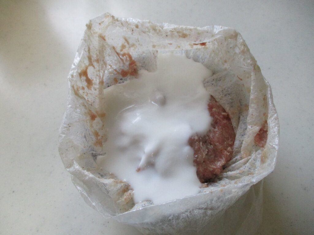 2,お肉に粘りが出てきたら、ポリ袋を広げて混ぜておいた米粉+豆乳を加え全体に混ぜ合わせる。
