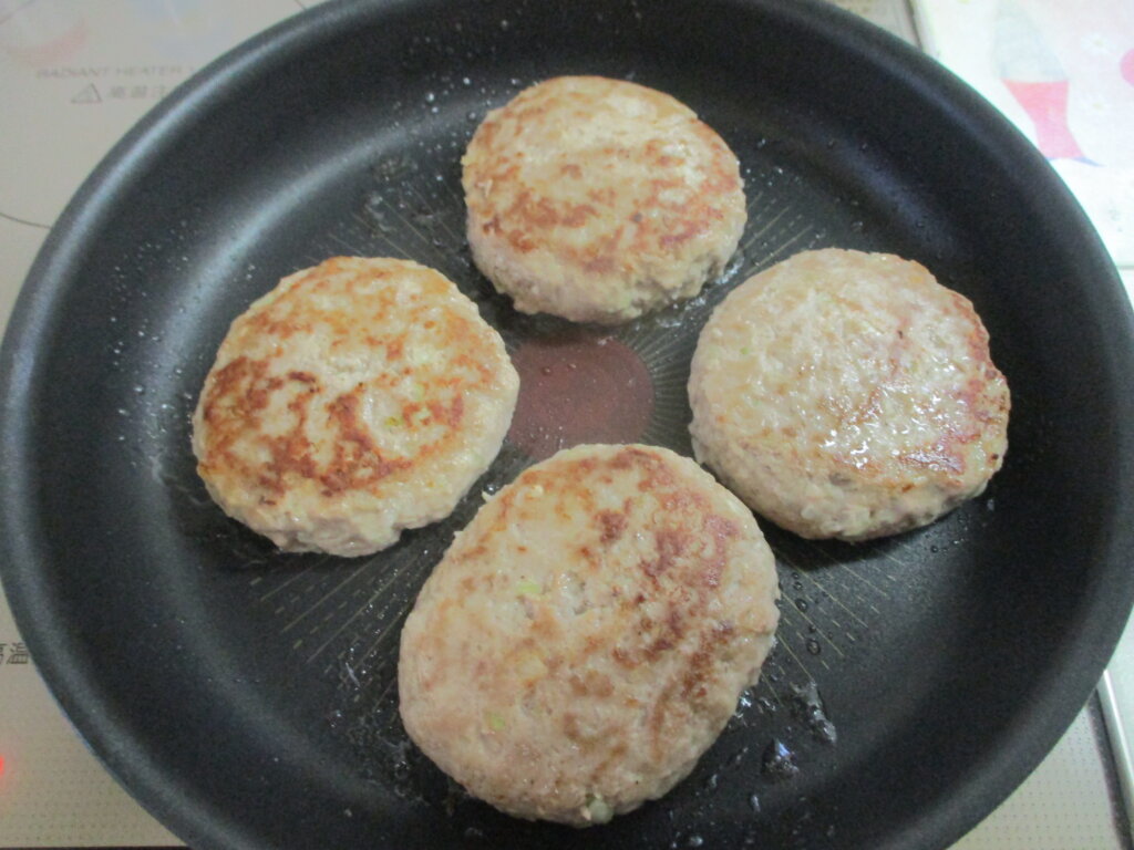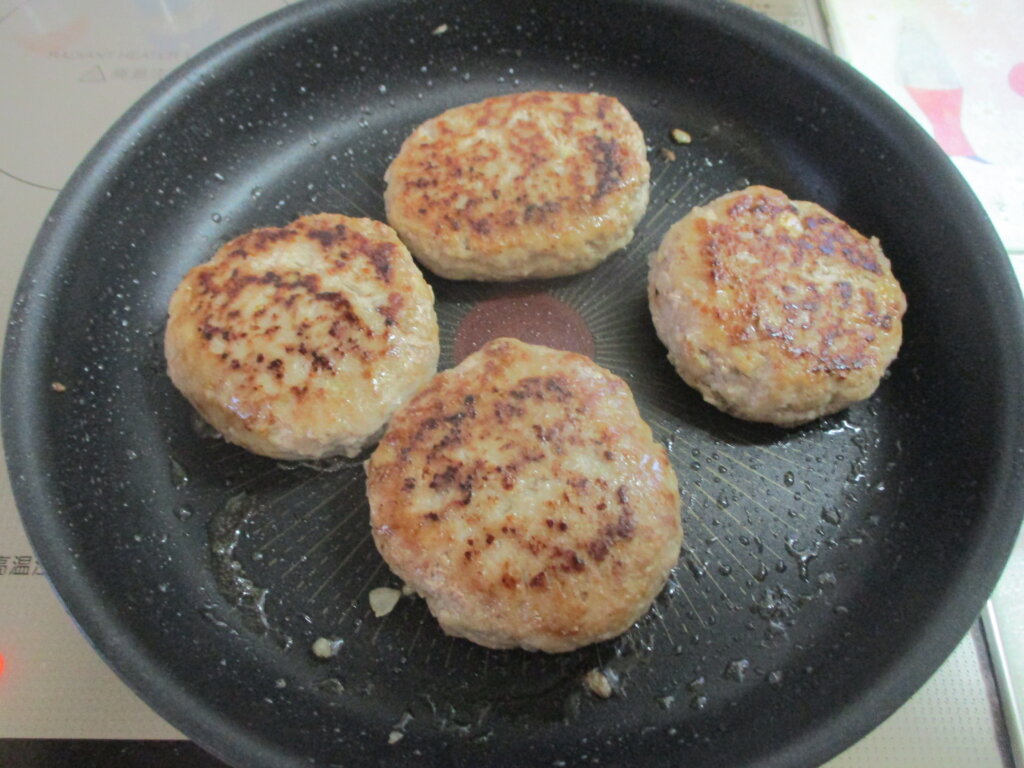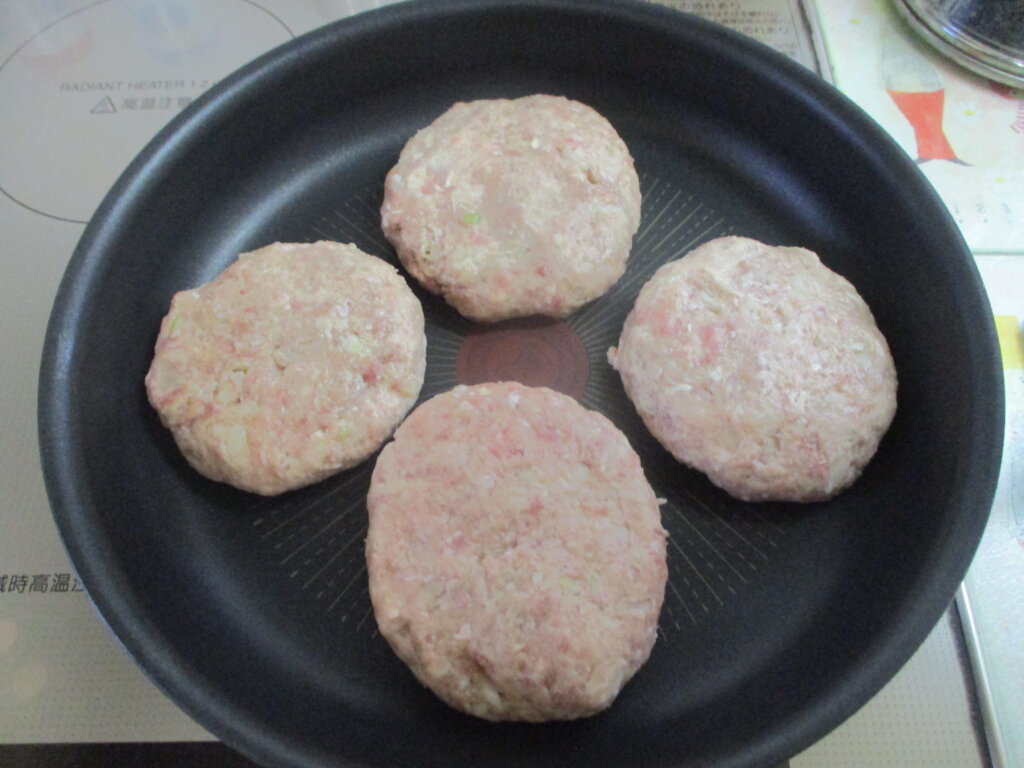 3,4等分にしてハンバーグ形に丸め表面を平らにしてフライパンで両面を中火でこんがりと焼く。