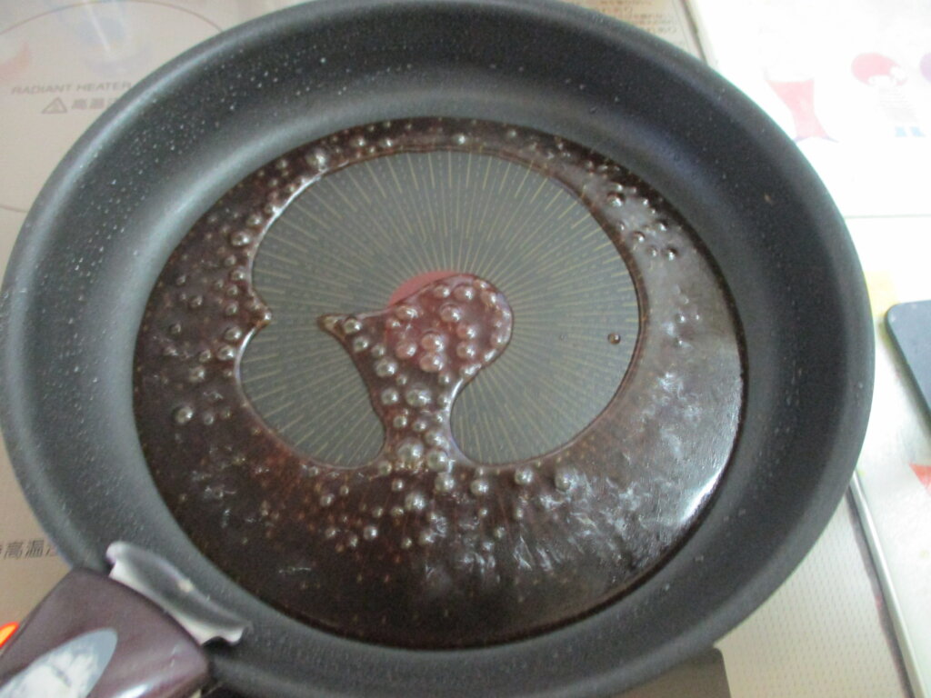 4,焼きあがったらハンバーグをお皿に取り出し、フライパンに照り焼きソースの材料を入れて煮詰め、ハンバーグにかける。