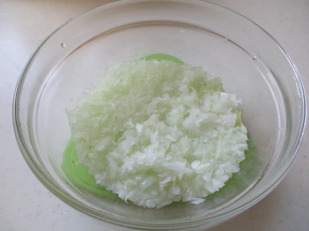 玉ねぎはみじん切りにして耐熱容器に入れ600wのレンジで3分加熱し冷ましておく。