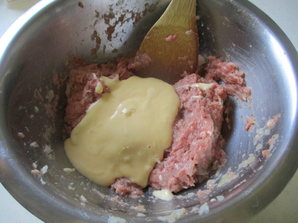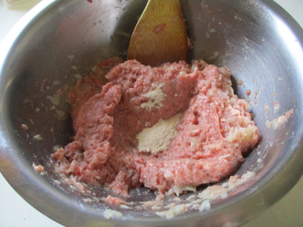 2,ひき肉、塩、コショウ、ナツメグを入れよく捏ねたら、冷ました玉ねぎと砂糖を加えて混ぜ合わせる。