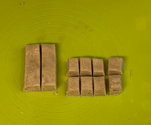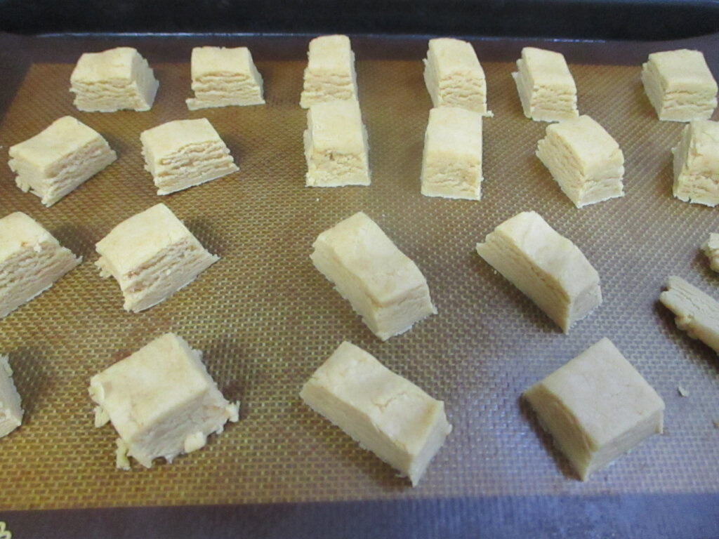 3,生地を台に取り出し1.5㎝の厚さに伸ばして広げたら、生地をスケッパーで半分にカットして積み重ねる作業を3回ほど行いミニサイズにカットして天板に並べ、180度のオーブンで20分ほど焼く。