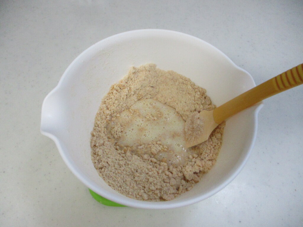 2,別のボウルに★を入れて泡立て器で混ぜ合わせたら、①の豆乳+米油を2/3量ほど入れてよく混ぜ、様子をみながら残りの液を加えて生地をまとめる。(液が少し残る場合もあります)