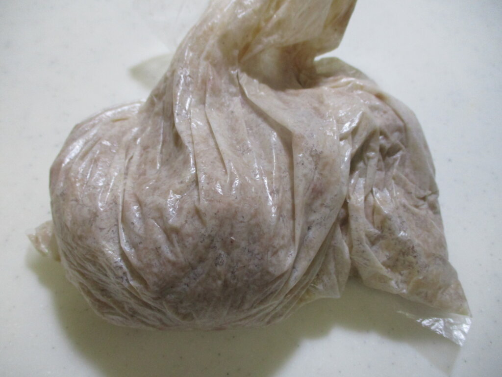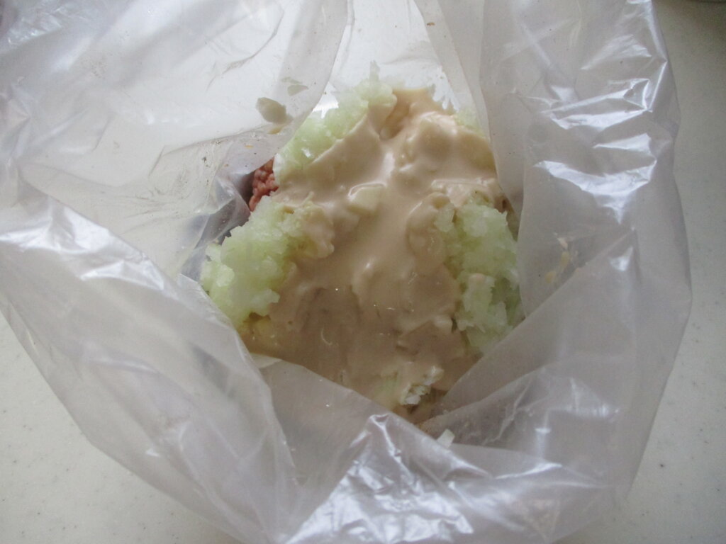 1,ポリ袋に、合いびき肉、塩、砂糖、コショウ、ナツメグ、うま味調味料を入れて全体にまぶしたら、みじん切りにした玉ねぎと合わせておいた米粉液を加えポリ袋の上からよく揉んで捏ねる。(白っぽくなるくらいまで)