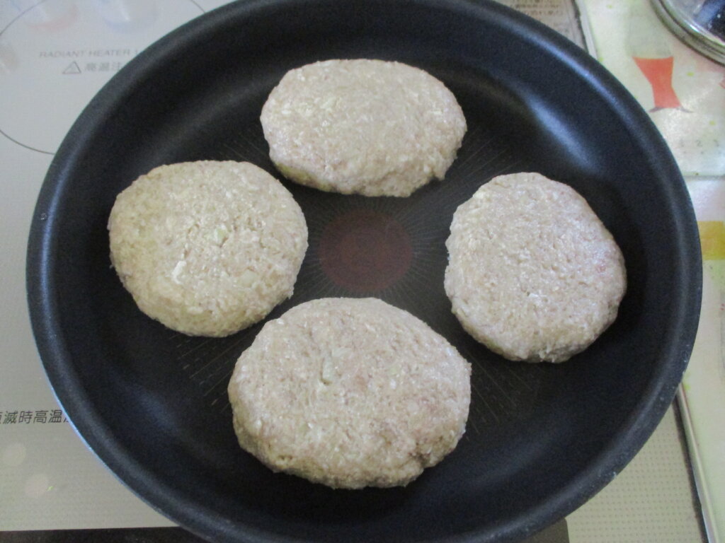 2,4等分にしてハンバーグの形に両面を平らにして形を整え、フライパンに並べる(火はまだつけない)