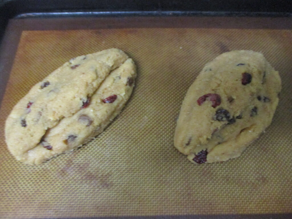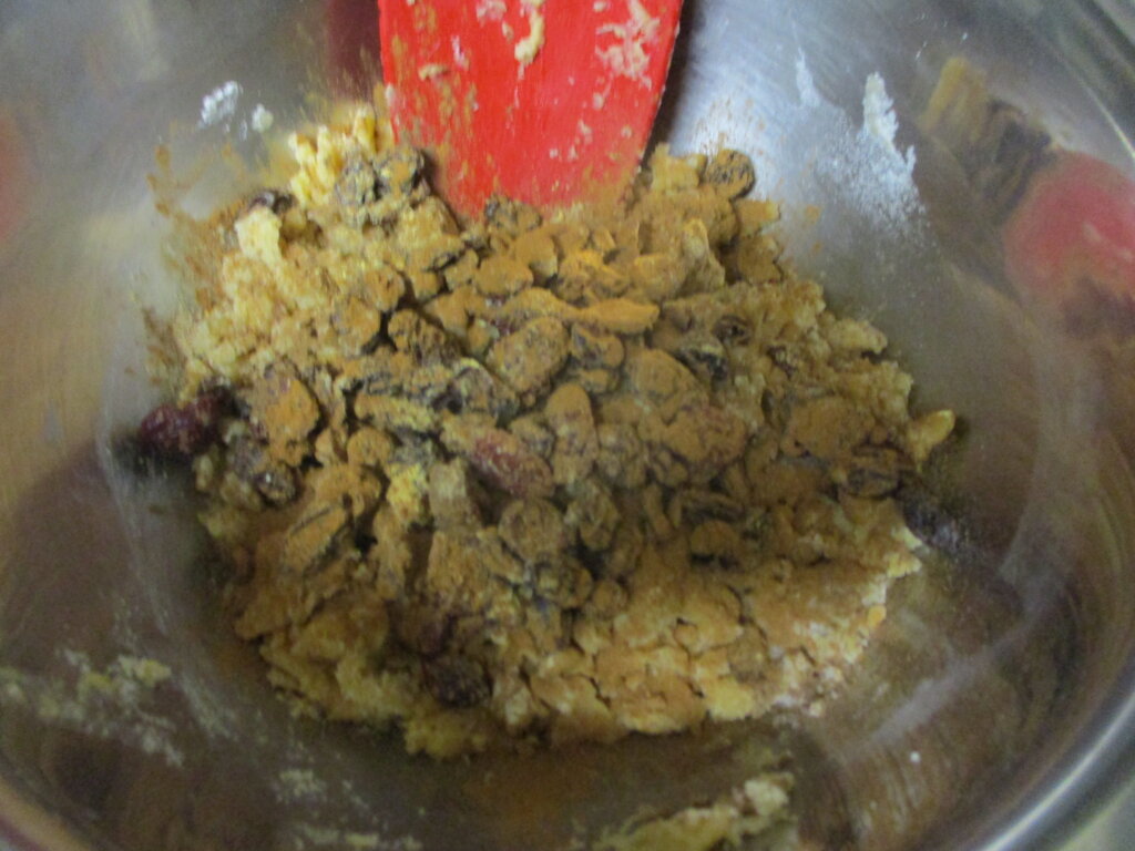 3,ドライフルーツとクルミとスパイスを加えて混ぜ合わせ、2等分してシュトーレンのような形にまとめる。