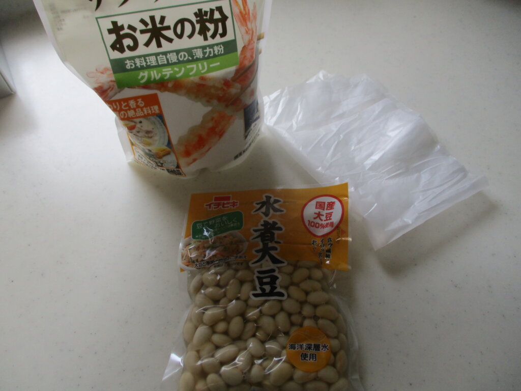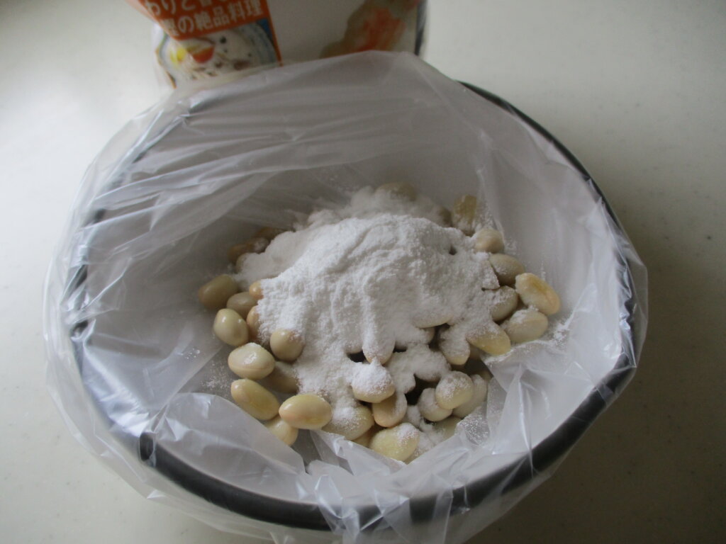 1,水気をきった大豆と米粉をポリ袋に入れて振り、全体に米粉をまぶす。