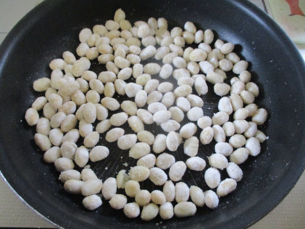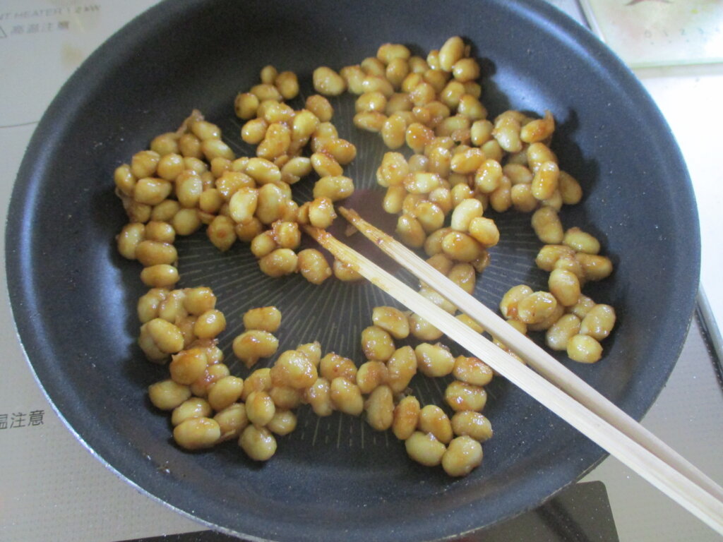 米粉を絡めた大豆は、フライパンで焼き色がつくまでしっかり炒めることで