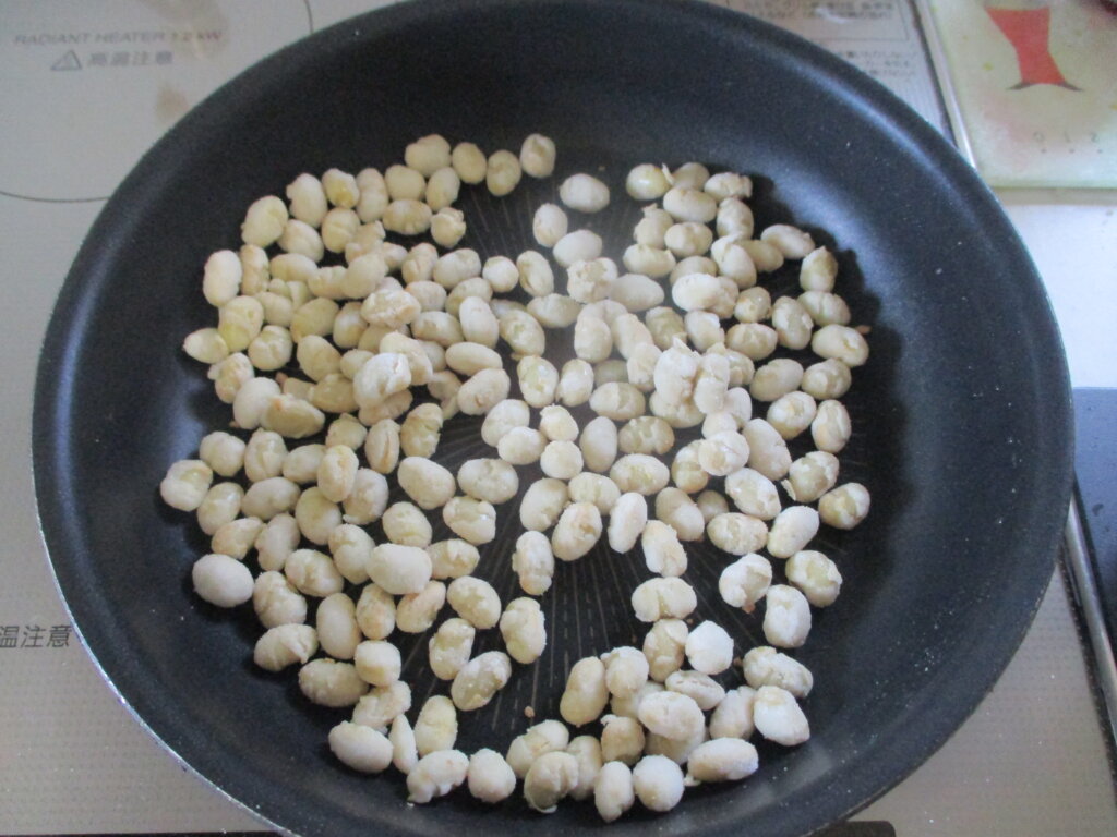 2,フライパンに大豆を入れ、油を絡めて焼き色がつくまでしっかり炒める。