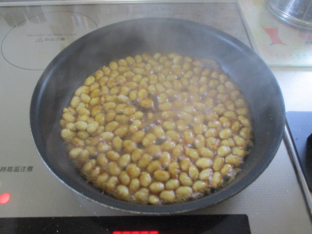 味付けするタレは事前に合わせて混ぜておき、大豆がカリッと焼けたところへ一気に加えて絡めてください。