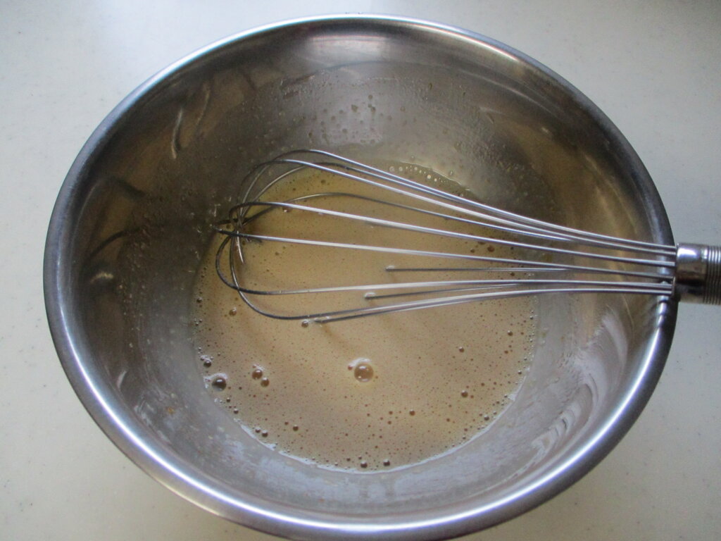 1,卵と砂糖をよく混ぜたら米油、豆乳の順に加えたらゴムベラにもちかえ、米粉とベーキングパウダーを加えて粉っぽさが残るくらいで混ぜるのをやめる。